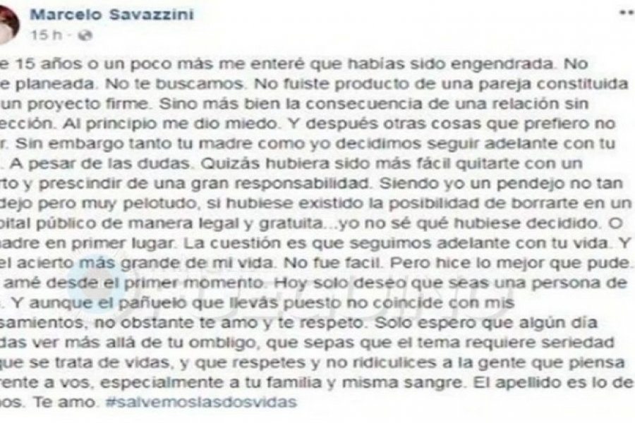 Faltaban pocas horas para que el sábado se convirtiera en domingo. Marcelo Savazzini, como tantos papás a lo largo y a lo ancho del país, se preparaba para celebrar el día del padre junto a Agustina, su hija de 15 años. En la Cámara de Diputados, el jueves por la mañana se había aprobado la media sanción de la ley que busca legalizar el aborto en Argentina. Savazzini sintió que tal acontecimiento brindaba el escenario ideal para escribirle a su hija, con quien no comparte la postura, y publicar una carta en Facebook dedicada a ella.