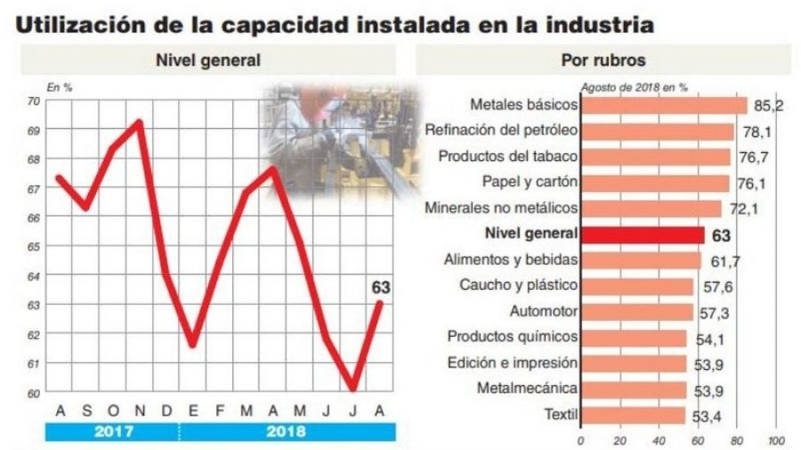 Los bloques que presentan, en agosto de 2018, una menor utilización de la capacidad instalada respecto al mismo mes del año anterior fueron las industrias metálicas básicas y la industria automotriz. En la producción de autos pasó de estar 55,1% a 57,3%, lo que se instauró como el registro más alto en mucho tiempo. \"Aunque es probable que en septiembre de bastante abajo porque ya lo vimos con el dato de producción de autos, en parte por las caídas de exportación de autos a Brasil\", aclaró Dragún de la UIA.