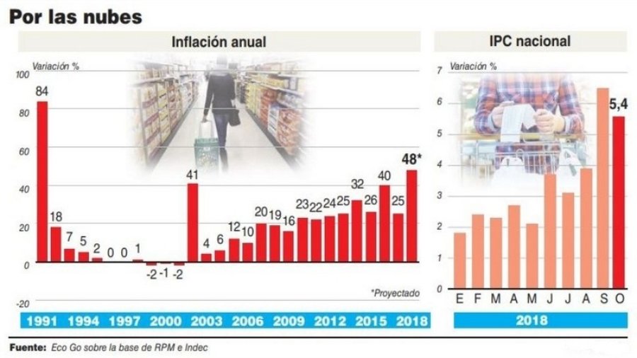 De cualquier forma, tanto en niveles de 47% como de 48%, el equipo económico ya no podrá evitar que el 2018 sea el año de mayor inflación desde 1991, a la salida de la híper, cuando la entrada en la convertibilidad comenzó a pisar el freno sobre los precios. Los años que tuvieron los niveles más cercanos fueron el 2016, también del actual Gobierno, y el 2002, que registraron 41%. El otro récord lo marcó el bimestre septiembre-octubre, cuya inflación fue de 12,2%. Ese nivel fue el más alto desde abril-mayo de 2002, que registró 14,8%.