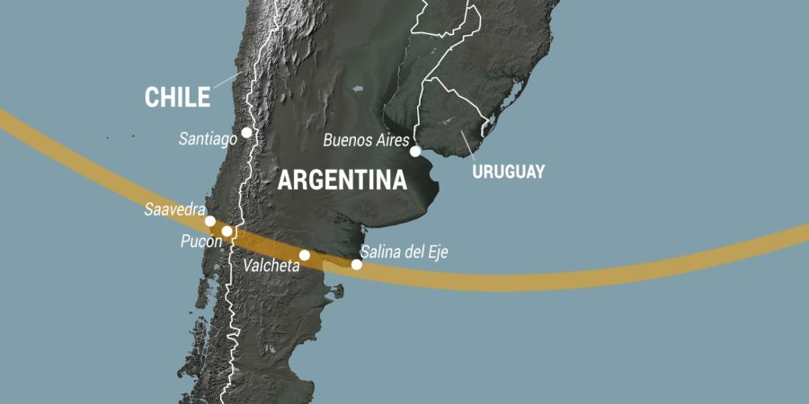 El eclipse cubrirá parte de Sudamérica, Atlántico y Pacífico Sur, pero sólo quienes se encuentren en la franja que cubre la zona norte de la Patagonia podrán verlo en su totalidad.