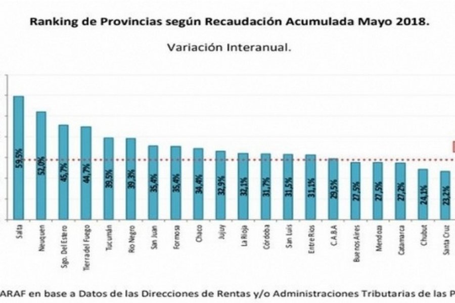 En las 21 provincias analizadas se recaudaron $194.756 millones en los cinco primeros meses del 2018, y registró un crecimiento del 27,1% con respecto a 2017; por lo que en términos reales la suba fue igual al 1,2%.