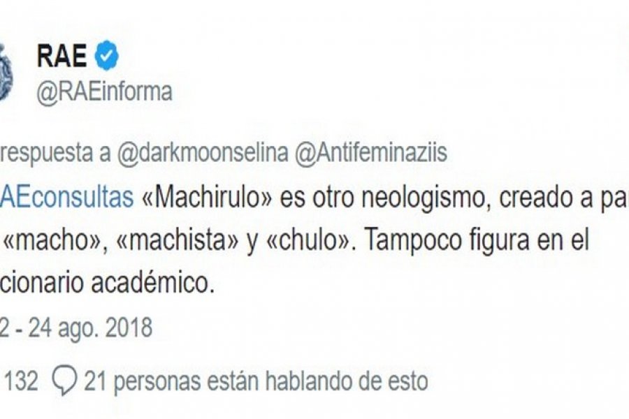 Más tarde, ante otra consulta sobre la palabra \"machirulo\", desde la RAE respondieron: \"«Machirulo» es otro neologismo, creado a partir de «macho», «machista» y «chulo». Tampoco figura en el diccionario académico\".
