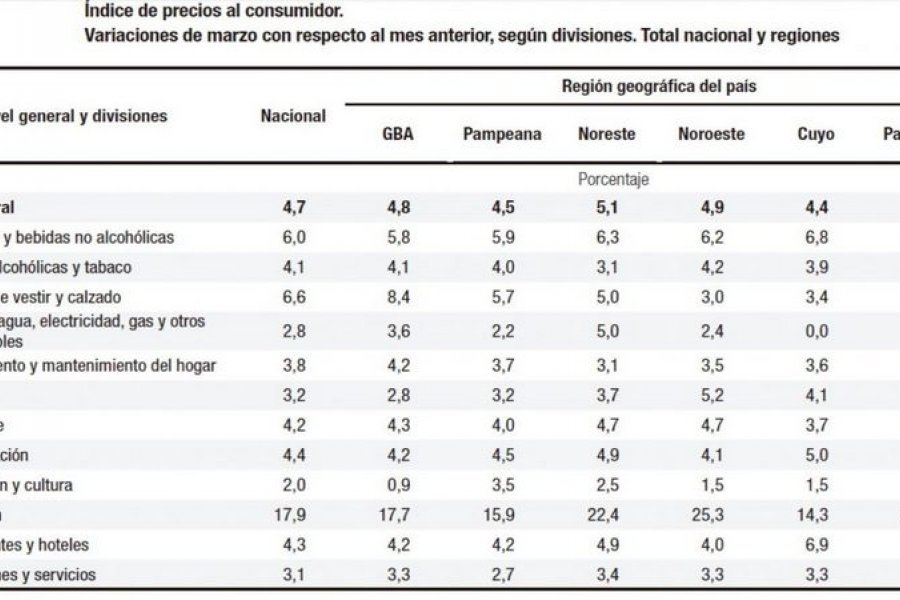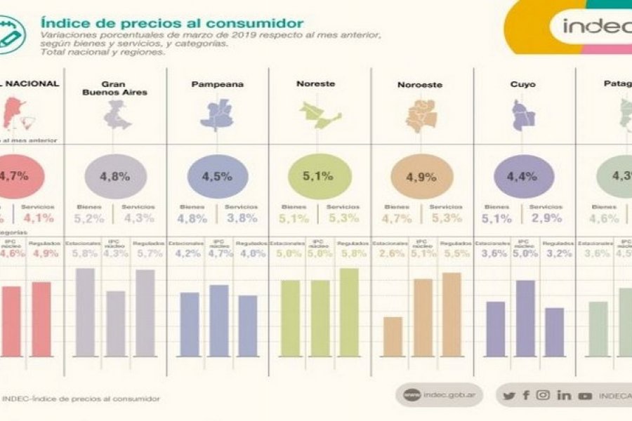 En el Noreste el aumento fue del 5,1% seguido por la zona del Noroeste, donde la suba fue del 4,9%. En el Gran Buenos Aires se registró un 4,8 seguido por la región Pampeana (4,5%), la de Cuyo (4,4%) y por último la Patagonia (4,3%).