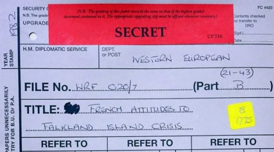 En su informe del 30 de junio de 1982 al Foreign Office sobre la actitud de Francia en relación al tema Malvinas, el embajador británico en París, John Fretwell, señaló: \"La reacción inicial del gobierno francés fue admirable. Mitterrand ordenó inmediatamente el apoyo total a Gran Bretaña, una orden que se tradujo en la ayuda francesa para establecer el embargo de armas y sobre el comercio de la Comunidad Europea, y en el apoyo francés en la Resolución 502. Recibimos valiosa información práctica de las fuerzas armadas francesas relacionada con la performance de los sistemas de armas franceses en servicio con las fuerzas argentinas. Mitterrand merece el crédito sustancial por esta reacción. Dudo si Giscard (o Chirac) hubieran respondido tan bien\".