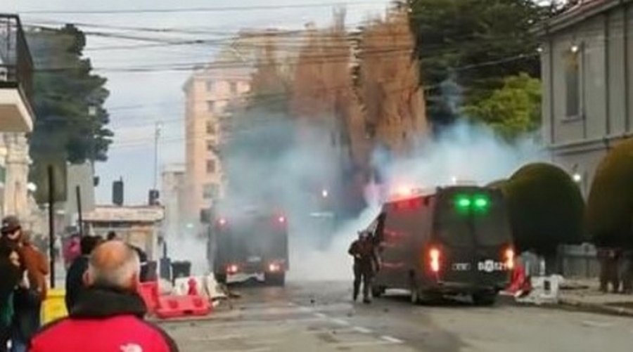 Pero la calma se terminó cerca de las 19 horas, en donde un grupo de manifestantes, ya que las protestas en el centro de Punta Arenas derivaron en incidentes entre los manifestantes y Carabineros. Con el carro lanzaagua y bombas lacrimógenas, la fuerza pública intenta controlar los hechos de violencia, que se mantienen en el centro de Punta Arenas. En una de las esquinas de la Plaza de Armas prendieron fuego. Hasta el momento no se conocen si hay detenidos.