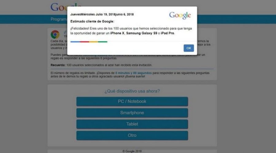 “Recuerda: 100 usuarios seleccionados al azar han recibido esta invitación. El número de regalos es limitado. ¡Dispones de 0 minutos y 00 segundos para responder a las siguientes preguntas antes de que le demos tu regalo a otro agraciado usuario!”, anuncia el mensaje.