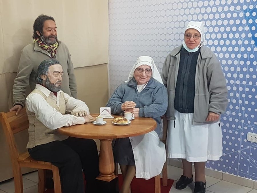 Se trata de una obra artística que reúne en una mesa de café a estas dos personalidades ilustres de la ciudad. “Con el correr del tiempo se fueron adecuando ciertas cosas, finalmente se dio esta presentación en la empresa Signo Sur que fue la que hizo todo el trabajo de montaje del grupo escultórico junto con la gente de Maderera Topic” añadió Gutiérrez.
