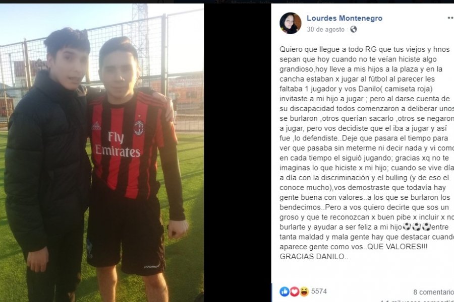 «Hoy lleve a mis hijos a la plaza y en la cancha estaban x jugar al fútbol al parecer les faltaba 1 jugador y vos Danilo (camiseta roja) invitaste a mi hijo a jugar ; pero al darse cuenta de su discapacidad todos comenzaron a deliberar unos se burlaron. Otros querían sacarlo ,otros se negaron a jugar, pero vos decidiste que el iba a jugar y así fue, lo defendiste» escribió la madre agradecida