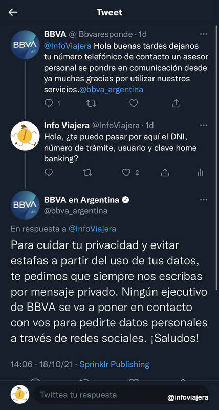 Unas horas después, la gente de redes sociales del banco BBVA (de verdad) se metió en la conversación para advertirnos de esa situación: