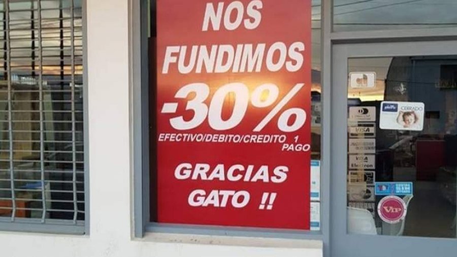 Y lo hizo promocionando las últimas ventas con un cartel bastante particular, que además tiene un destinatario directo: el presidente Mauricio Macri. “Nos fundimos”, reza el cartel de fondo rojo con letras en blanco que ofrece descuentos de hasta un 30 % en compras con tarjetas de débito y crédito en un pago y en efectivo.