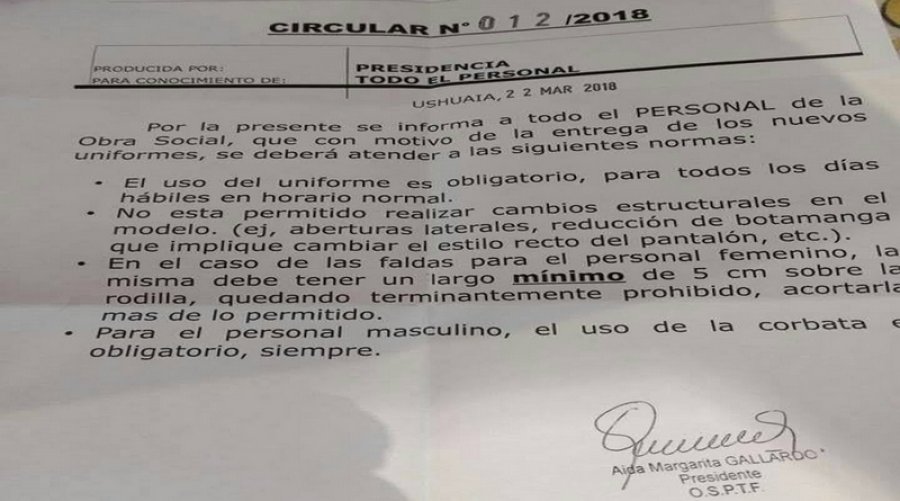 Se trata de la Circular Nº 12 -que firmó la presidente del Directorio de la Obra Social, Margarita Gallardo- y que establece una serie de indicaciones para el uniforme que deberá utilizar el personal del organismo. En el texto, específicamente se advierte que la pollera de las mujeres “debe tener un largo mínimo” de 5 centímetros sobre la rodilla, y que está “terminantemente prohibido” acortarla.