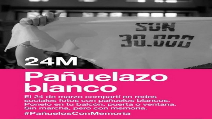 Los organismos de derechos humanos convocaron para este martes 24 de marzo a un “pañuelazo blanco”, una original iniciativa para que a través de redes sociales y desde los frentes de los domicilios particulares se compartan pañuelos, para conmemorar el Día Nacional de la Memoria por la Verdad y la Justicia, ante la imposibilidad de realizar la tradicional marcha por el aislamiento social, preventivo y obligatorio decretado por el Gobierno nacional a raíz del coronavirus.