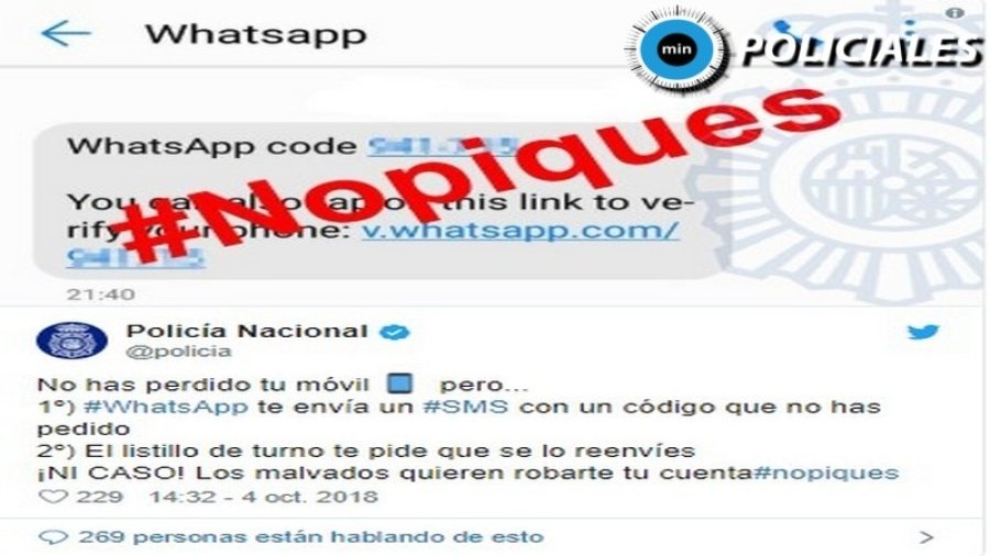 \"No has perdido tu móvil, pero... 1º) #WhatsApp te envía un #SMS con un código que no has pedido 2º) El listillo de turno te pide que se lo reenvíes ¡NI CASO! Los malvados quieren robarte tu cuenta #nopiques\", escribió la Policía Nacional de España en su cuenta de Twitter.