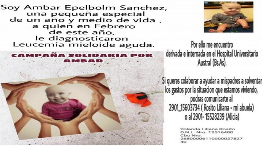 Un llamado a la solidaridad fue lanzado horas atrás a la comunidad fueguina, para colaborar con la pequeña Ambar Epelbolm Sánchez, niña de Ushuaia de un año y medio quien, meses atrás, fuera diagnosticada con leucemia mieloide aguda.