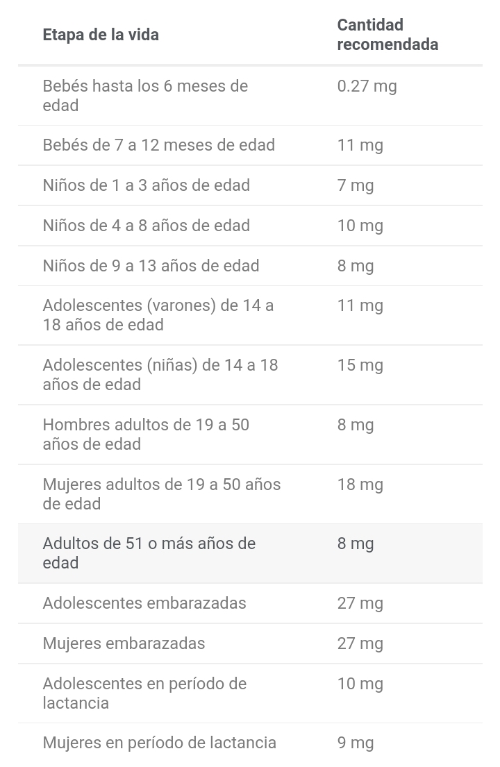 En definitiva, es fundamental contar con unos niveles óptimos de hierro para el correcto funcionamiento del organismo. Así, desde el Instituto Nacional de Salud de los Estados Unidos establecen los valores necesarios de este mineral de forma diaria: