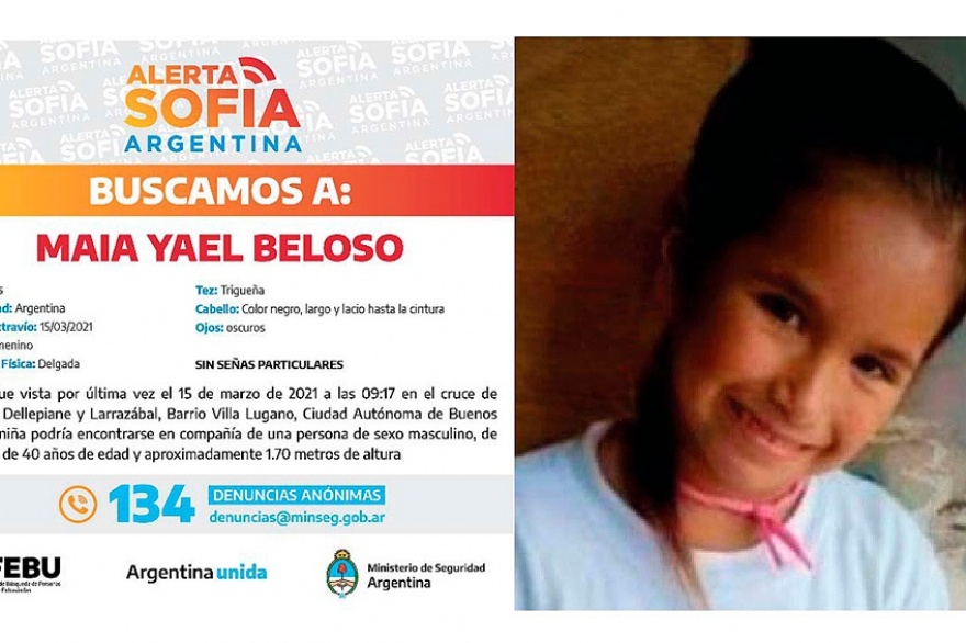 Desde este lunes a la mañana la mamá de Maia Yael Beloso busca desesperadamente a su hija, con quien vivía en situación de calle en el barrio porteño de Villa Lugano. Maia, una niña de siete años, se separó de su madre cuando un hombre al que habían conocido hacía poco tiempo, le prometió llevarla hasta un local donde le cambiaría su bicicleta por una más grande. A las nueve y media de la mañana el hombre se la llevó y nunca la regresó junto a su madre. La Fiscalía en lo Criminal y Correccional N° 54, a cargo de Laura Belloqui, lleva adelante la investigación, mientras que las fuerzas de seguridad nacionales y de la Ciudad buscan a Maia. El Ministerio nacional de Seguridad activó el Alerta Sofía, un sistema de difusión de búsqueda de niños, niñas y adolescentes extraviados, previsto para casos de extremo riesgo