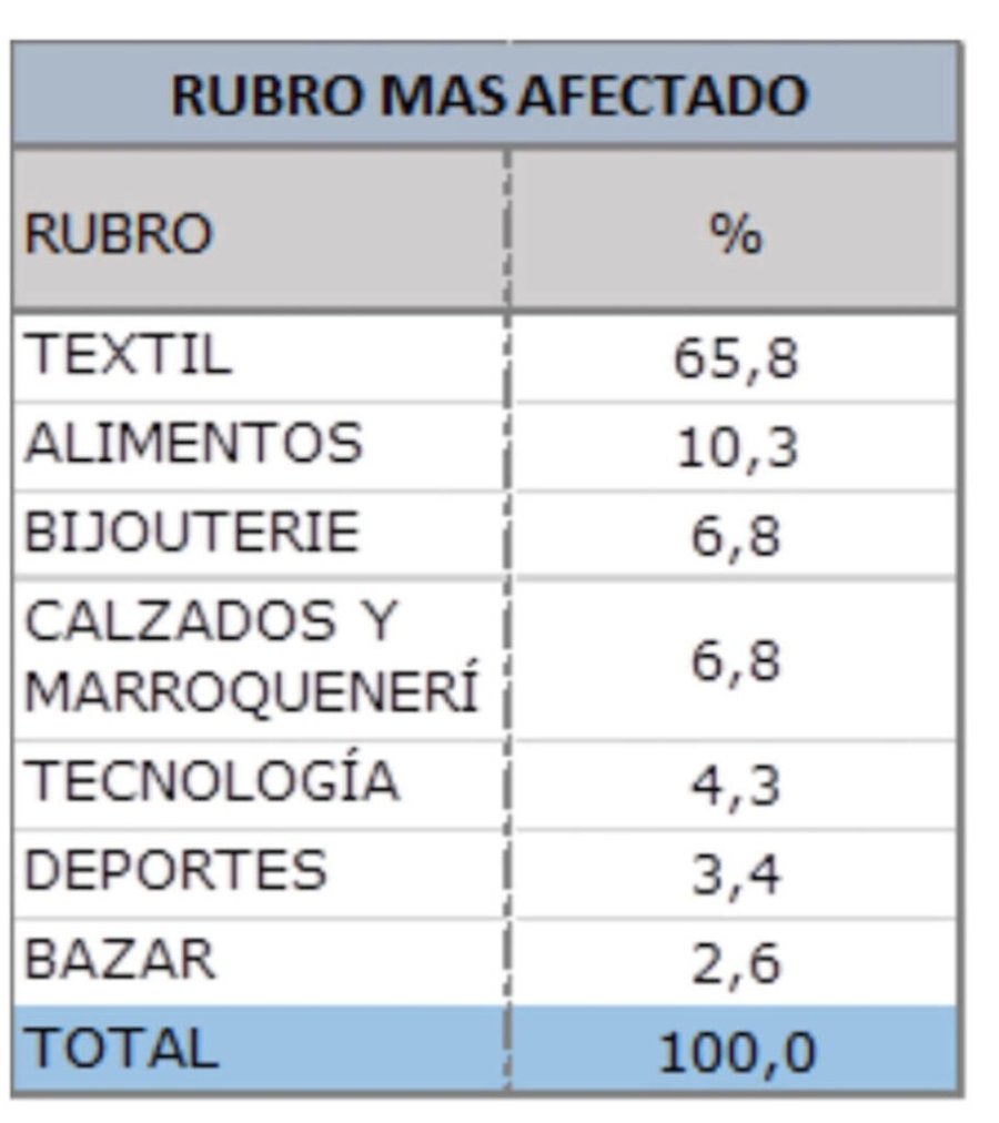 Una encuesta sobre comercio ilegal realizada por la Confederación Argentina de la Mediana Empresa (CAME). De acuerdo con los resultados, el rubro “Textil” es el más afectado con un 65,8%, seguido por “Alimentos” con un 10,3%. Ambos representan el 76% del flagelo que afecta a los pequeños y medianos comerciantes.