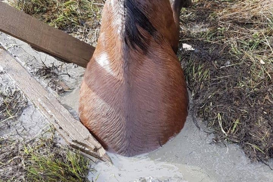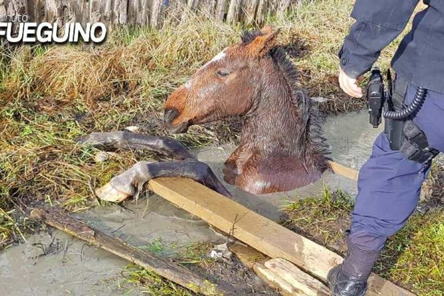En el lugar se hizo presente personal de Comisaria Cuarta donde se constató que el animal estaba parcialmente sumergido en una zanja de barro y agua, cubriendo la totalidad de su cuerpo dejándose ver únicamente parte del cuello y cabeza.