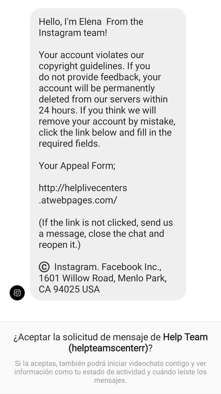 Es posible que en algún momento hayas recibido un mensaje directo a tu cuenta de Instagram desde una supuesta cuenta de soporte de Instagram o Facebook, en donde se te indica que tu cuenta infringió una normativa en relación a los derechos de autor o alguna otra cuestión.