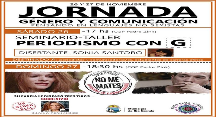 Organizadas por el programa radial Tarde pero Seguro y el acompañamiento del Municipio de Río Grande, el diputado Martín Pérez, los y las concejales Miriam Mora, Verónica González y Alejandro Nogar; el próximo sábado 26 y domingo 27 de noviembre se realizarán en el CGP Padre Zink las jornadas “Género y Comunicación: pensando en lenguajes no sexistas” orientadas a periodistas y comunicadores/as y público en general.