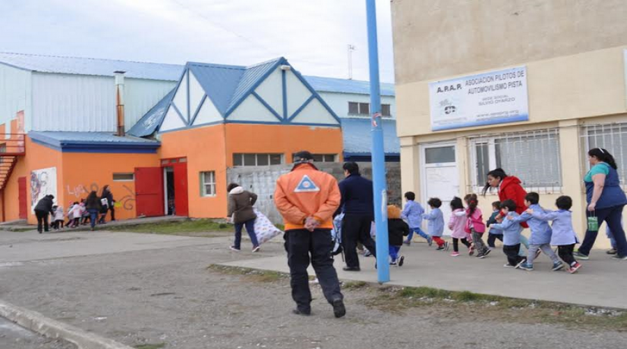 Defensa Civil del Municipio de Río Grande participó de un importante simulacro de evacuación en el Jardín de Infantes N° 5 ‘Tol Olejce’ de Chacra II, acompañando y guiando a los pequeños de 3 a 5 desde el establecimiento de nivel inicial hasta el Polideportivo ‘Carlos Margalot’ de Chacra II.