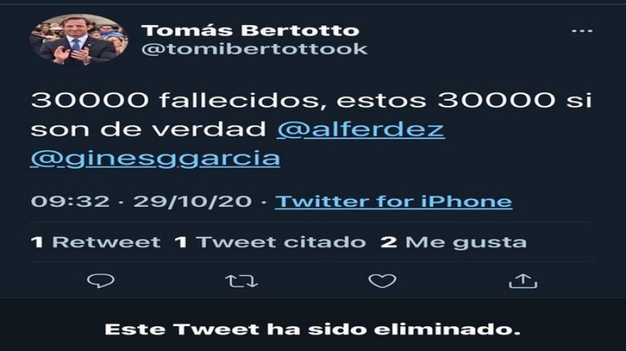 El exedil escribió esta mañana en Twitter: \"30 mil fallecidos, estos 30 mil sí son de verdad\" y arrobó en el tuit al presidente Alberto Fernández y al ministro de Salud, Ginés González García.