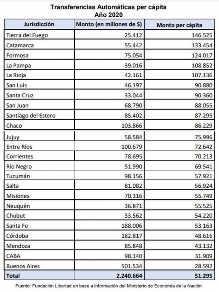 “Hay provincias que presentan valores mayores y otras menores que dicho guarismo. Las que se destacan dentro del primer grupo son: Tierra del Fuego con $146.525 por habitante, le siguen Catamarca con $133.454 y Formosa con $124.017. Junto a La Pampa y La Rioja que arrojan $108.852 y $107.136 respectivamente, son las únicas jurisdicciones que superan los 100 mil pesos per cápita”, explicó el informe.