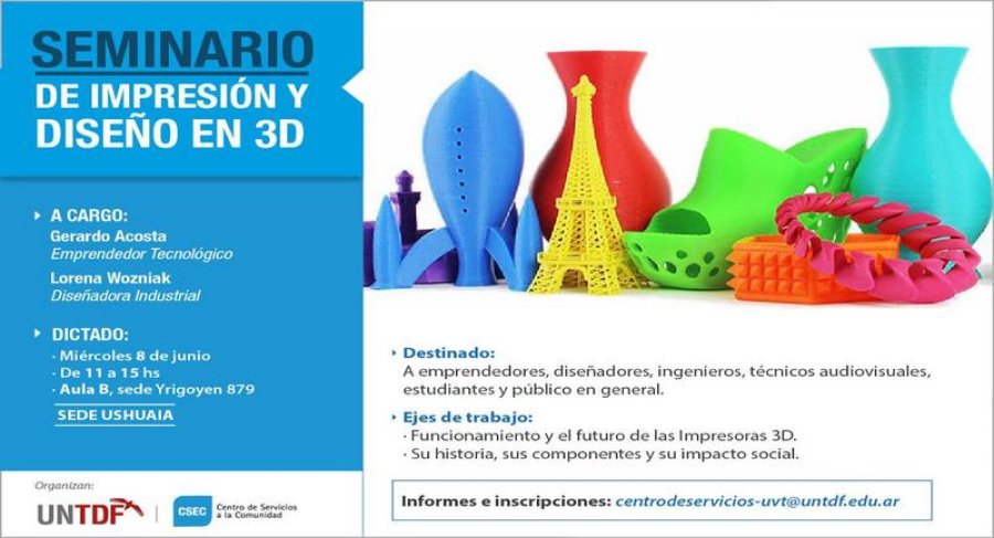 La Universidad Nacional de Tierra del Fuego (UNTDF), a través de su Centro de Servicios a la Comunidad, recuerda que hoy martes 7 es el último día de inscripción para participar del “Seminario sobre impresión y diseño en 3 D”. La capacitacion con entrada libre y gratuita se desarrollará mañana miércoles 8 de junio, de 11 a 15 horas, en el aula B de la sede universitaria ubicada en Yrigoyen 879 de Ushuaia