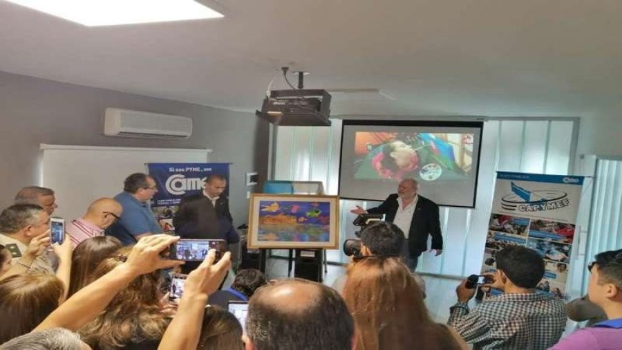 “Fue una emotiva presentación de un cuadro de la artista formoseña de capacidad especial que nos donó la Cámara de Comercio e Industria de Río Grande, a través de Diego Navarro y ‘Gigi’ Iglesias”, compartió el presidente de la CAPYMEF, Fabián Hryniewicz.