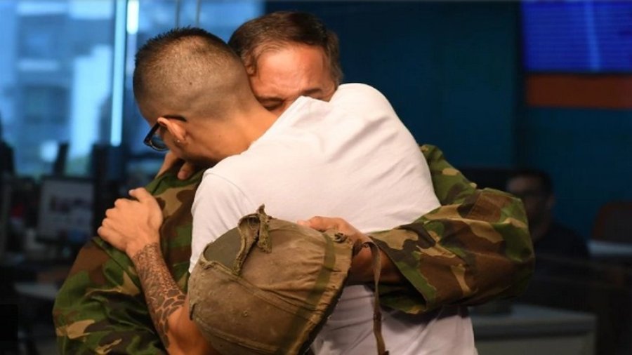 Pablo Deluca, Director de Asuntos Institucionales de Infobae ingresa a la sala y le habla al soldado. Le cuenta de todos los argentinos que siguieron su historia, que quisieron saber, ayudar, del privilegio de poder ser parte de este momento. Cuando la directora periodística,Valeria Cavallo, acerca el casco, le emoción de Altieri es incontenible.