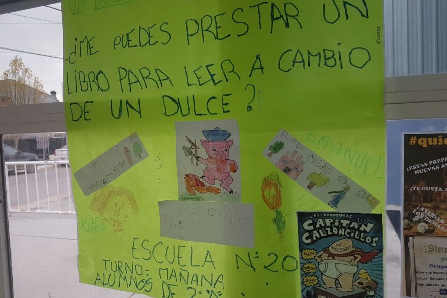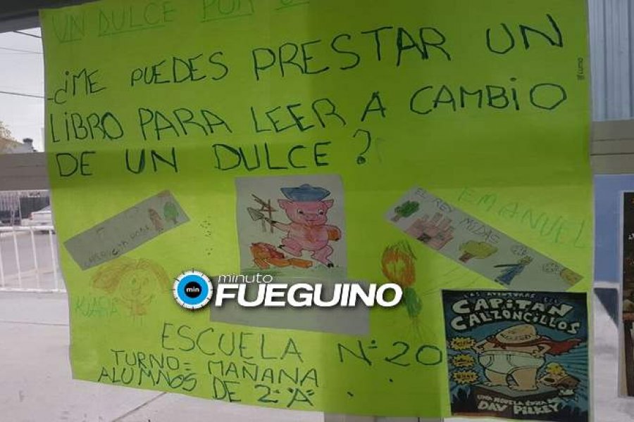 Alumno de 2º A de la Escuela Nº20 “Angela Loij” de la ciudad de Río Grande se encuentran llevando adelante la campaña “Un libro por un dulce”, la cual consiste que cualquier persona que lo desee puede donar algún libro, diccionario, revistas, enciclopedias, manuales, ect., para que los alumnos puedan formar su propia biblioteca en el aula.