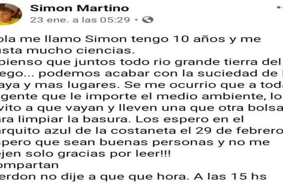 Simón en su mensaje dice: “Hola me llamo Simón tengo 10 años y me gusta mucho ciencias. Y pienso que juntos todo Río Grande Tierra del Fuego… podemos acabar con la suciedad de la playa y mas lugares. Se me ocurrió que a toda la gente que le importe el medio ambiente, los invito a que vayan y lleven una que otra bolsa para limpiar la basura. Los espero en el barquito azul de la costanera el 29 de febrero. Espero que sean buenas personas y no me dejen solo, gracias por leer”.