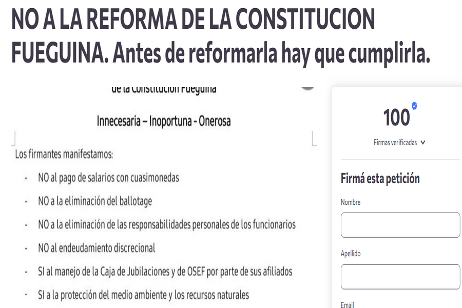La discusión por la Reforma de la Constitución de Tierra del Fuego sumó un nuevo capítulo: un grupo de vecinos inició una campaña de firmas en internet para pedir que no se convoque a convencionales ni se avance con cambios en la Carta Magna provincial.