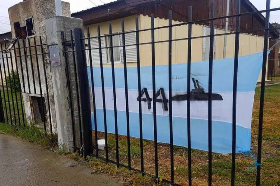 En la primera de ellas, se pueden apreciar dos banderas, una sobre la reja y otra que ondea al costado de la puerta de ingreso. En ambas, se ve la silueta del submarino de la Armada con el número 44, que recuerda a sus tripulantes.