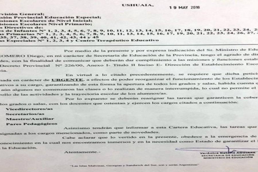 El ministro Romero ordenó que con carácter de \"urgente\" se reasignen tareas en los grados y salas que aún se encuentran sin clase, a fin de garantizar el derecho a la educación de los niños y jóvenes. Publicamos facsímil nota Ministro de Educación.