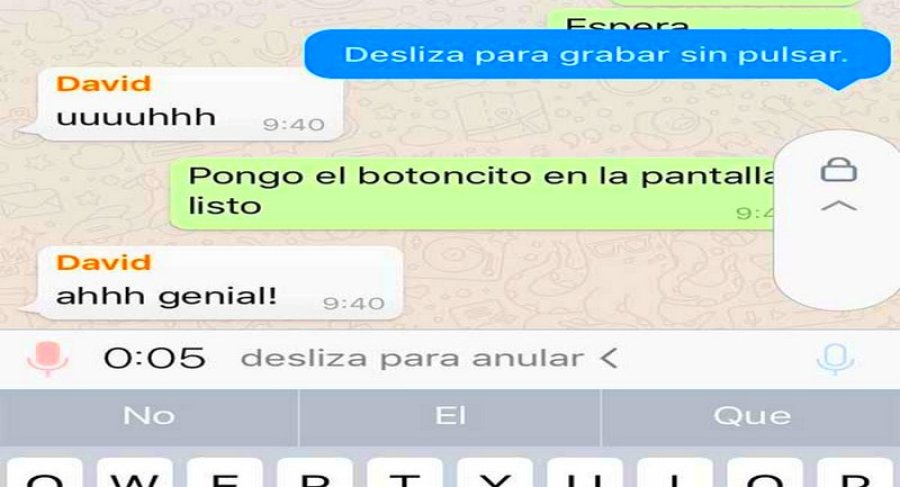 Para utilizar la nueva función, solo hay que presionar el icono del micrófono y esperar a que aparezca un candado en la parte superior. Si deslizamos el dedo hacia arriba, la grabación se mantendrá todo lo que queramos. Luego, será cuestión de pulsar el icono triangular para enviar o «cancelar» en el caso de que queramos cancelar el mensaje de audio.