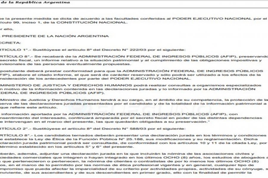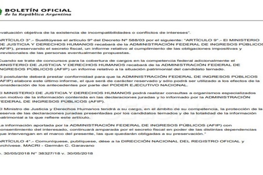“Proponemos un análisis más profundo, para saber si hay inconsistencias. Si el día de mañana hay sospechas, vamos a tener una radiografía de los jueces, con sus bienes, sus propiedades y sus consumos y el Presidente tendrá un panorama exhaustivo y claro a la hora de elegir qué candidato de la terna nomina”, resaltó el ministro de Justicia, Germán Garavano.El candidato deberá prestar conformidad para que la AFIP elabore el informe, que será reservado y sólo podrá ser utilizado para la consideración de los antecedentes por parte del Poder Ejecutivo.