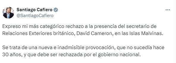 En sintonía, el excanciller Santiago Cafiero manifestó su “más categórico rechazo” a la presencia Cameron en Malvinas y lo definió como una “provocación”. “Se trata de una nueva e inadmisible provocación, que no sucedía hace 30 años, y que debe ser rechazada por el gobierno nacional (...) Sorprende y preocupa el silencio de la Cancillería argentina. El rechazo y la protesta de este tipo de actos y provocaciones no es una hostilidad. Es usar el derecho internacional para preservar derechos que le corresponden a la República Argentina”, aseguró.