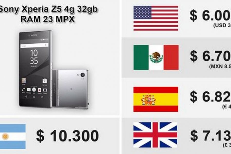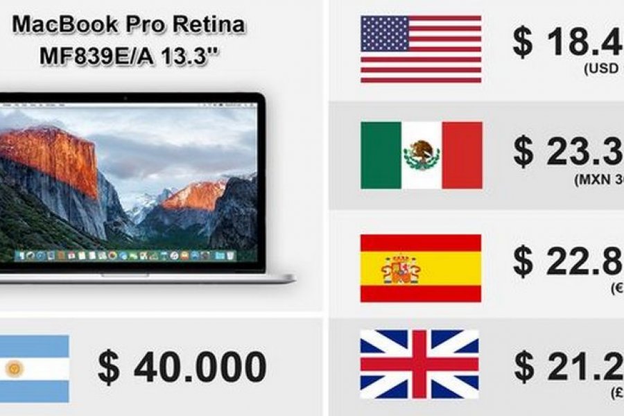 El contraste es significativo en el sector tecnológico. Un televisor a precio de \"oferta\" (samsung 40\" UN40J5300) cuesta en la Argentina un 85% más que en los Estados Unidos, un 79% más que en Gran Bretaña, un 75% más que en España y un 35% más que en México. La brecha es similar para un celular Sony Xperia Z5 y se agiganta para productos que es más difícil encontrar en el mercado local, como una Mac Book Pro.