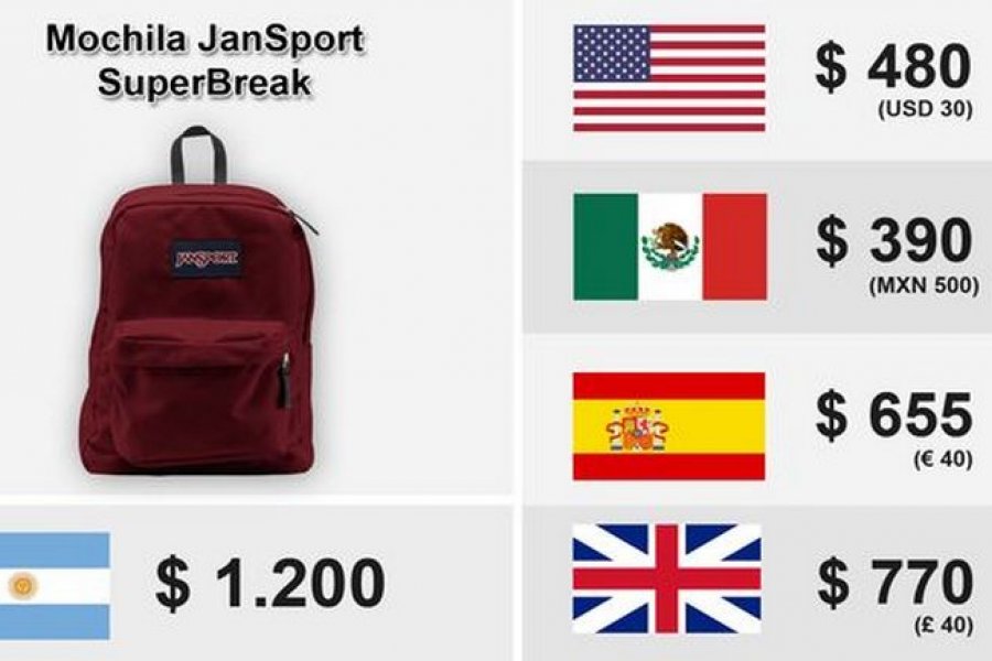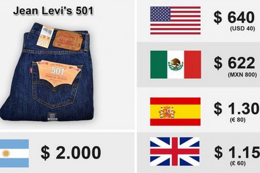 Basta con recorrer un shopping de Buenos Aires para encontrarse con precios imposibles en algunas prendas de uso diario como puede ser un pantalón o una remera. Por ejemplo, el mismo jean marca Levis que en algunos comercios outlets se puede comprar a $2.000 en México se vende a 800 pesos mexicanos ($622 aprox); en Estados Unidos a USD 40 ($640); en Londres a 60 libras ($1.158) y en España a 80 euros ($1.300). Algo similar sucede con el modelo Superstar de zapatillas Adidas, que en los últimos meses se puso de moda en la Argentina a un precio de venta que es altísimo cuando se lo compara con otras naciones.