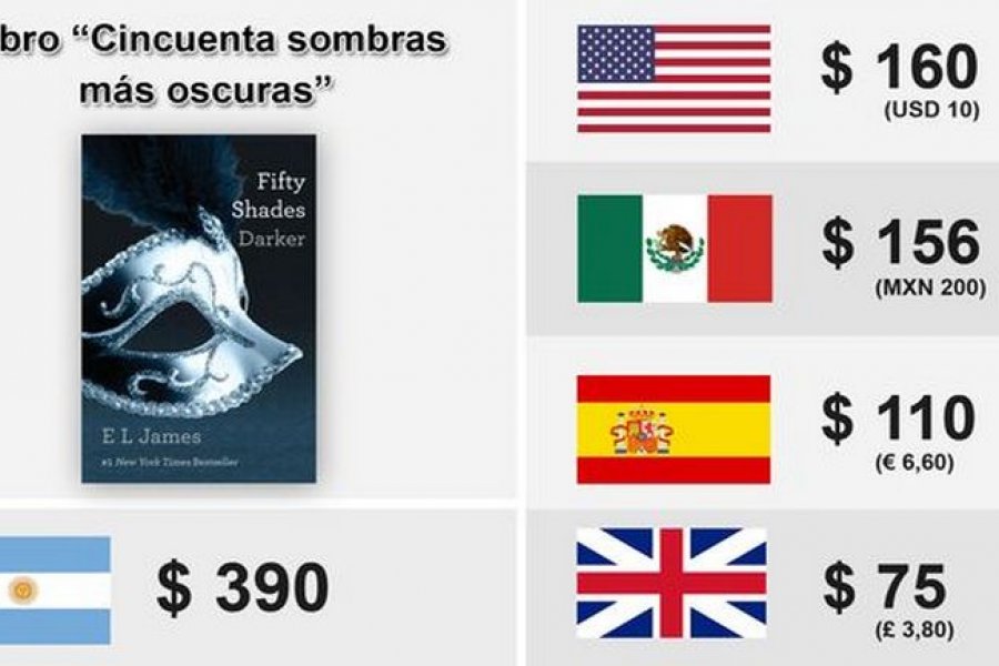 La cultura no es la excepción. Con el reciente estreno de la película que protagonizan Dakota Johnson y Jamie Dornan, en las librerías de todo el mundo creció el interés por el segundo libro de la trilogía de Cincuenta Sombras, escrita por Erika Leonard Mitchell. Pero los fanáticos de la saga que viven en el norte del continente tienen más facilidad para comprarlo. El libro impreso de tapa blanda que en la Argentina se vende entre $380 y $400, en Estados Unidos y México se puede conseguir por 160 (USD 10). Y en Europa es aún más barato: $75 en Gran Bretaña (3,8 libras) y $110 en España (6,6 euros).
