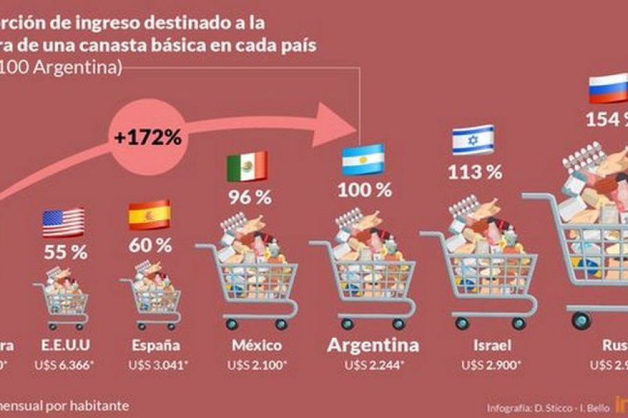Para comparar con otros países es necesario tomar en cuenta el esfuerzo que debe hacer cada trabajador o familia para adquirir una idéntica canasta de alimentos y bebidas con el fruto de su ingreso. Las diferencias no radican exclusivamente en cuestiones cambiarias o de carga de los impuestos, como se esgrime habitualmente en el mundo de los economistas.