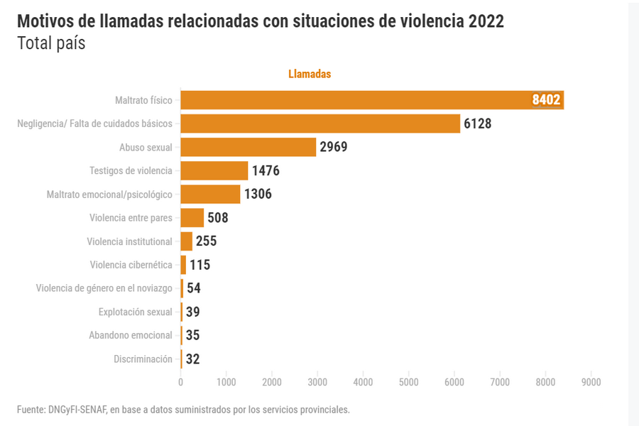 La línea 102 también ofrece una radiografía sobre las distintas características de la violencia infantil: más de la mitad de las llamadas están relacionadas con distintos tipos de violencia sobre niños. Otro de los motivos que suele repetirse es el pedido de ayuda por la falta de cuidados básicos a un niño, catalogado oficialmente como “negligencia” por parte de los padres o tutores, que representan otro 30% de esas llamadas.