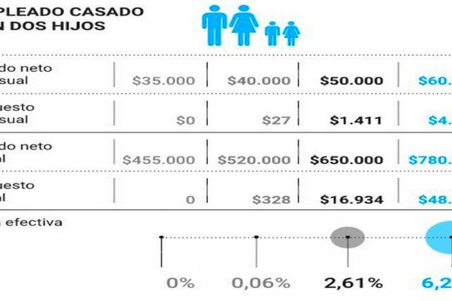 A medida que se avanza en los ingresos, la tasa efectiva del impuesto captura una porción mayor del sueldo. Así, para un soltero sin hijos, que gana $40.000 mensuales, en el año Ganancias se lleva $16.043 (3,09% del ingreso neto total); con $50.000, la retención salta a $47.270, - 7,27% o casi un sueldo entero por año, y con $60.000, más de un sueldo: $85.684 o el 10,99%.