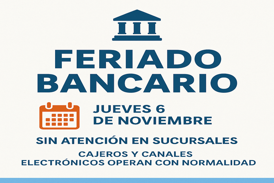 Este jueves 6 de noviembre los bancos de todo el país no abrirán sus puertas al público por la conmemoración del Día del Bancario. La jornada es no laborable para el personal, por lo que no habrá atención en ventanillas ni en mesas comerciales.