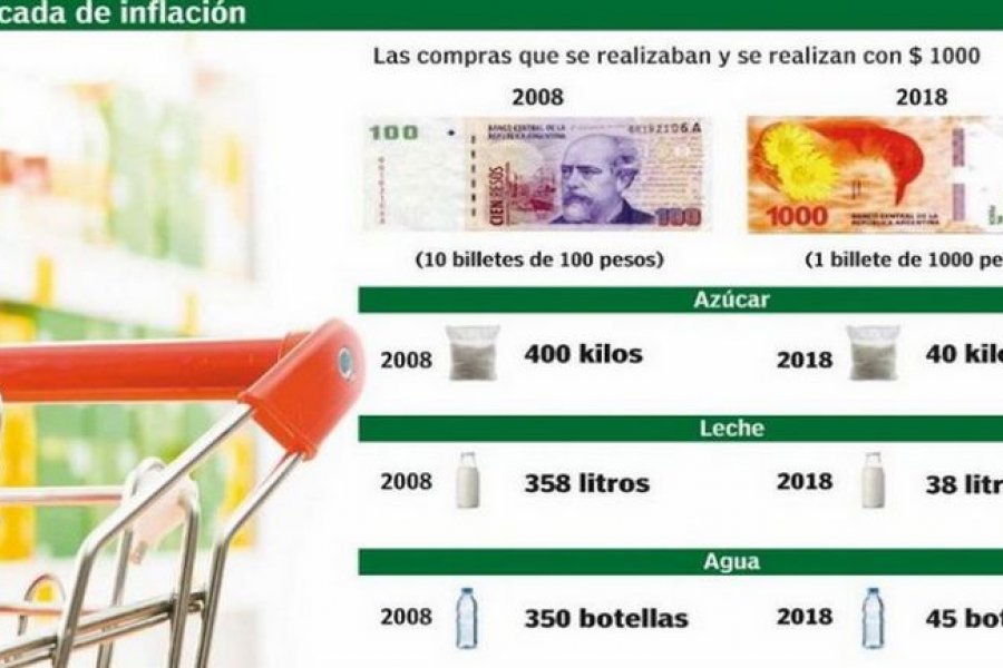 Según el informe \"diez años de inflación\", en 2008 se podían comprar 400 kilos de azúcar, 358 litros de leche o 350 botellas de agua mineral con $ 1.000 (diez billetes de Roca). Hoy, con la misma suma, equivalente a un billete amarillo del hornero, se pueden comprar 40 kilos de azúcar, 38 litros de leche o 45 botellas de agua.