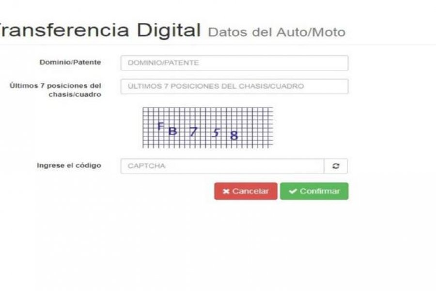 En el caso del vendedor, iniciar la precarga colocando el dominio del auto y los últimos siete dígitos del chasis/cuadro (surge del título y/o cédula). Luego ingresar un código que muestra la pantalla y hacer click en \"Confirmar\".