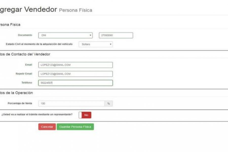 Si se trata de persona física, la pantalla solicitará una serie de datos personales y de contacto, así como también el porcentaje de venta. Clickear \"siguiente\". Solicitará que se indique si el trámite lo realizará a través de representante. De no corresponder, hacer click en \"Guardar persona física\".
