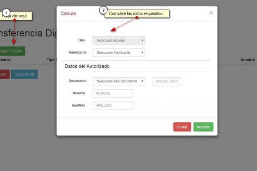 En el caso que solicite cédulas autorizadas, el sistema pedirá los datos personales de a quienes vaya a autorizar. Una vez completados presionar \"Aceptar\". Verificará los datos de los autorizados, seleccionar \"Aceptar\" y luego \"Siguiente\".