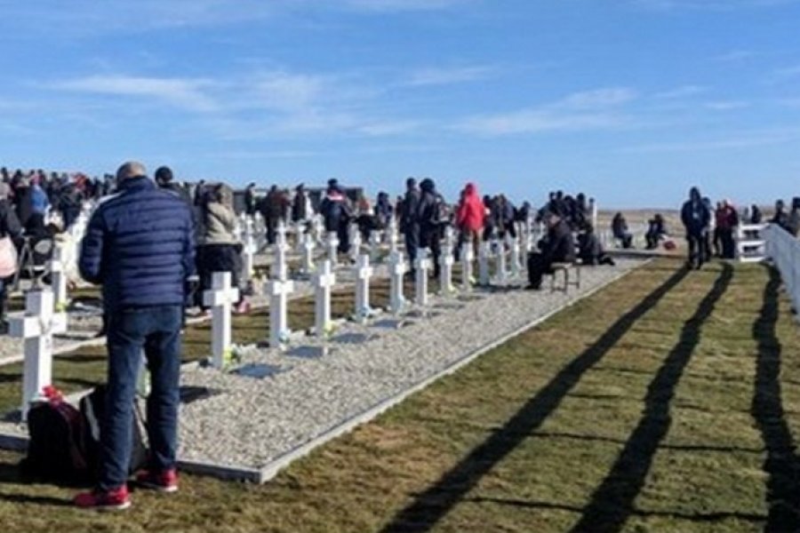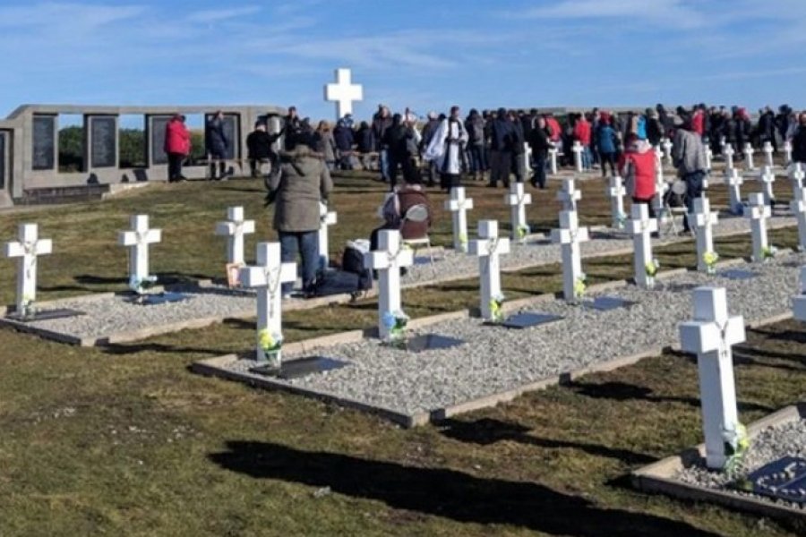 El sol brilla y el viento de las Islas Malvinas parece haber disminuido su fuerza solo para las familias que ahora rezan y lloran frente a las cruces blancas en el cementerio de Darwin.